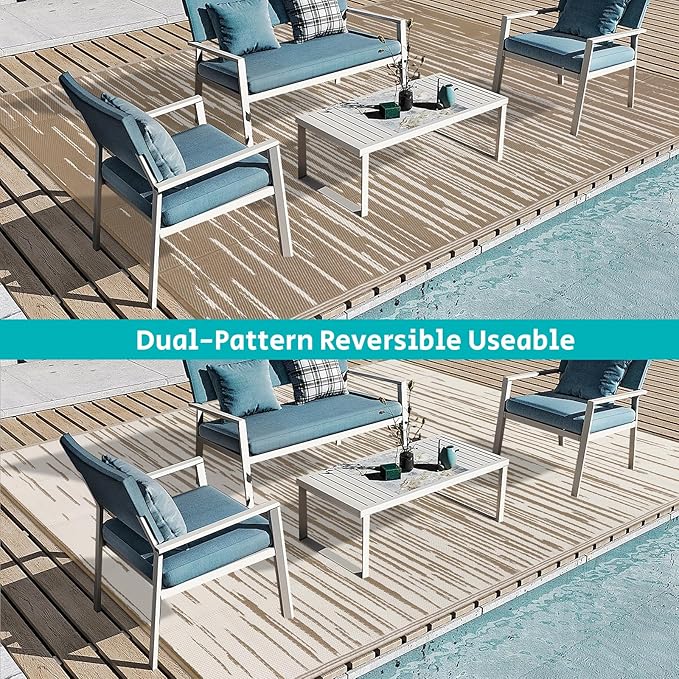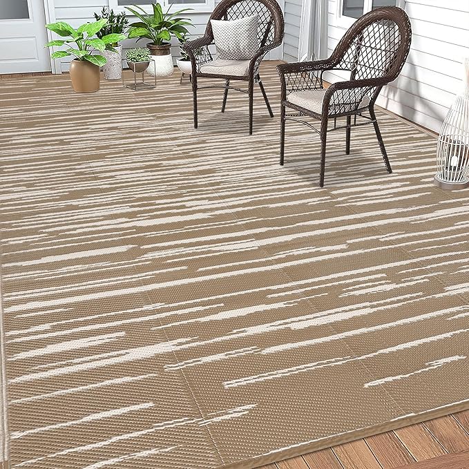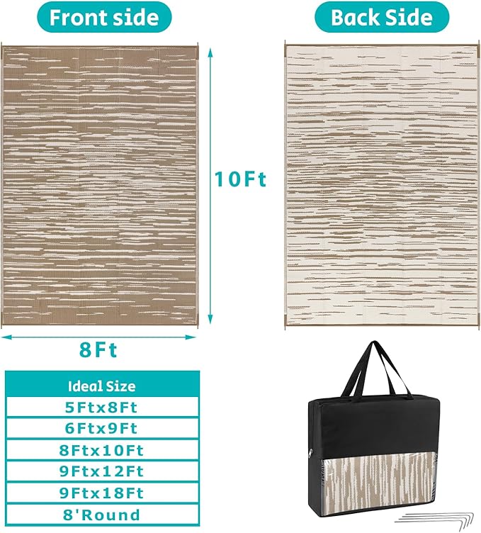 - XXL Large Reversible Outdoor Rugs: Featuring a classic striped pattern on both sides, this 8x10 ft outdoor area rug allows you to instantly refresh your patio, porch, backyard, deck, RV campsite. And this outdoor deck rug is reversible, two-sided design allows you to have two different looks,both sides can blend perfectly with nature and look very full and comfortable.