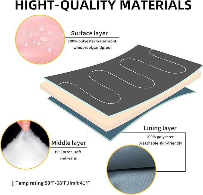 - Comfortable Sleeping Experience:Our sleeping bag can be used in 3 seasons with a design optimal comfort temperature of 59℉,temp rating 50°F-68°F.This lightweight sleeping bag is perfect for weather camping trips in Spring through to Autumn.Give you a comfortable sleep after a day of adventure outdoor camping, backpacking, hiking, and outdoor travel.