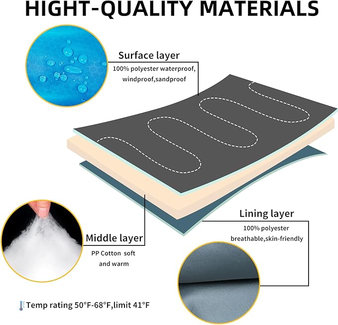 - Comfortable Sleeping Experience:Our sleeping bag can be used in 3 seasons with a design optimal comfort temperature of 59℉,temp rating 50°F-68°F.This lightweight sleeping bag is perfect for weather camping trips in Spring through to Autumn.Give you a comfortable sleep after a day of adventure outdoor camping, backpacking, hiking, and outdoor travel.