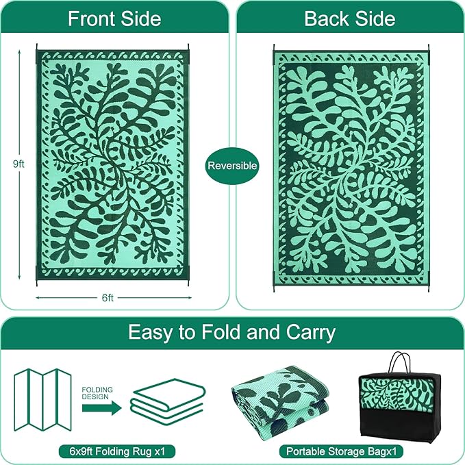 - Foldable & Portable: Our outdoor patio rug features multiple fold lines, allowing it to fold effortlessly into a compact size that fits conveniently into the included carry bag. It also comes with 4 stakes to secure the mat outdoors during rv camping and picnics, so you don’t have to worry about it being blown away