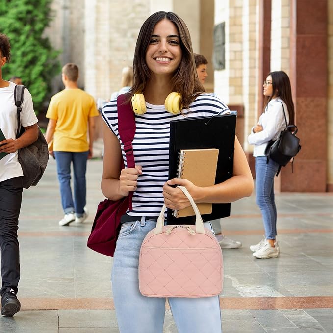 Pink Quilted Lunch Tote Bag, Insulated Thermal Cooler, Portable and Reusable Large Capacity for Office, School, or Picnic, 8.5L