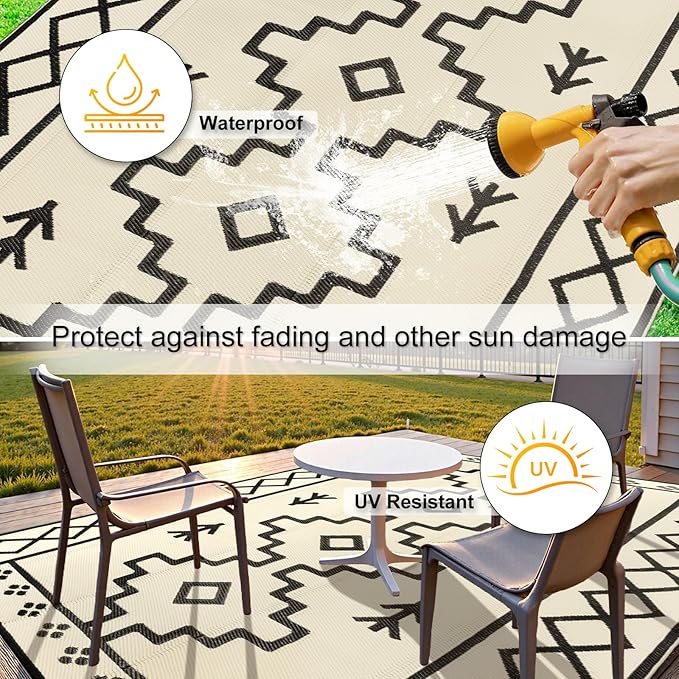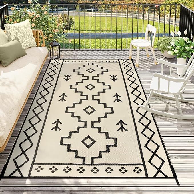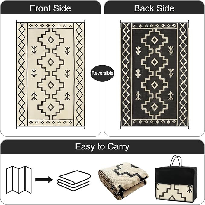 - Reversible and Versatile: This outdoor camping rug is designed with two-sided geometric patterns, if one side is messed up, just flip over to get a new one. It can be widely used in porch, patio, balcony, RV, deck, backyard, camper, balcony, picnic, tent