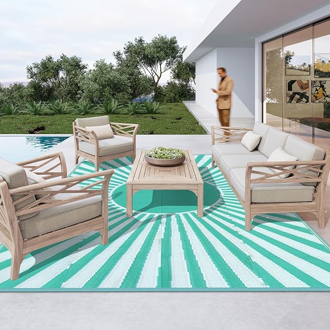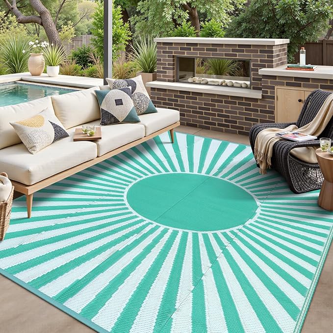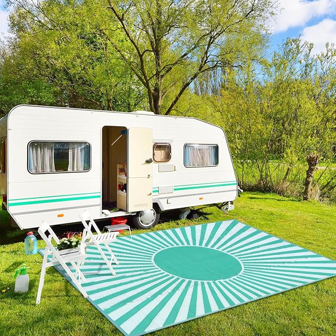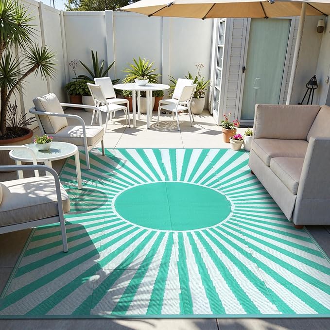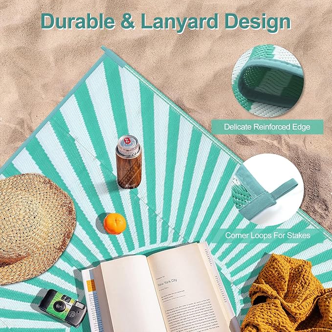 - [Versatile Outdoor Rug] The large outdoor rug is woven from a breathable, comfortable plastic material that won't damage your deck or lawn. Ideal for patio, deck, garden, backyard, balcony, camping, picnics, tent, RV road trips, beach and indoor rooms