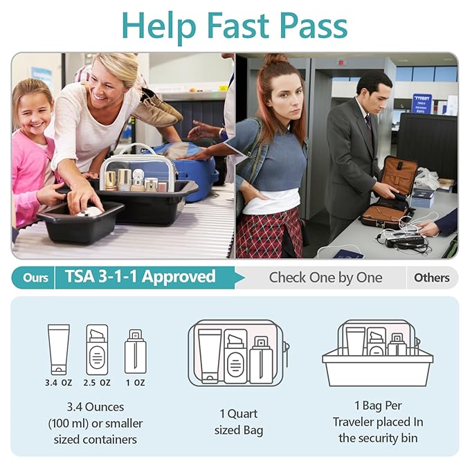 - TSA Approved: This medium size: 7.8 x 2.3 x 5.9 inch. Clear makeup bag follows the 3-1-1 Liquid Rule of airlines. When placing travel-sized containers that are 3.4 ounces or 100 milliliters in this quart-sized bag, you can quickly pass the airport security screening