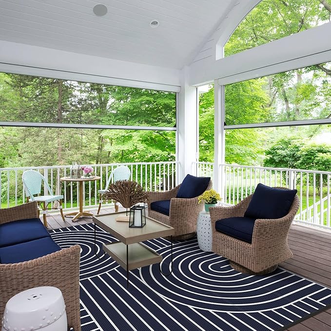 - Stylish Geometric Design: Elevate your outdoor spaces with GENIMO's striking geometric outdoor rug. The modern frame and sleek rectangular center create a timeless visual appeal, blending effortlessly with nature. Whether you're decorating your patio, garden, balcony, or RV, this geometric pattern will bring an elegant touch to any environment