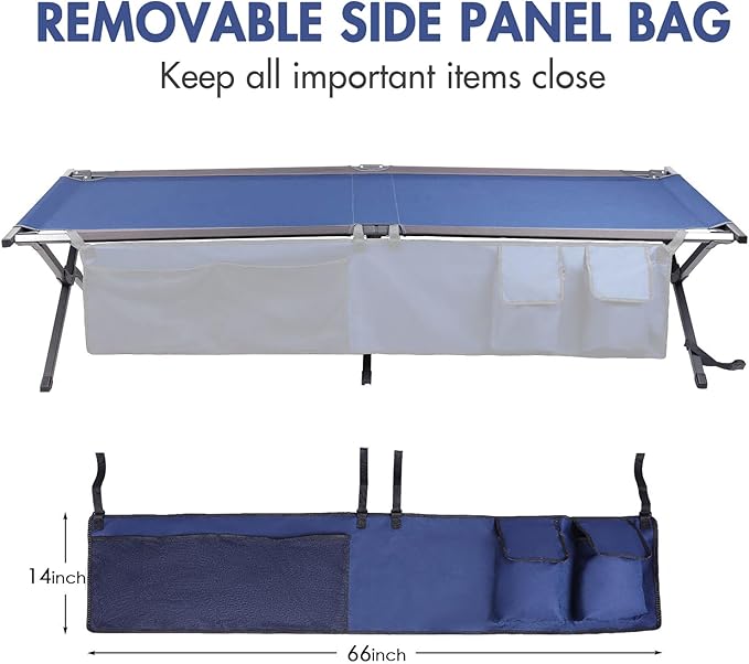 - PORTABLE AND EASY TO USE: This camping cots for adults can be quickly assembled or deconstructed thanks to two end braces and three scissor-action folding legs, making it easily portable for on-the-go adventures. It comes with an included carry bag, so you can take it with you anywhere.