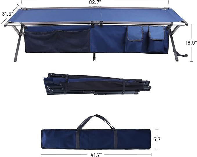 - PERFECT SIZE AND WEIGHT CAPACITY: With a weight capacity of 300 lbs., this camping cot measures 41.73" x 8.86" x 5.71" when collapsed and a generous 82.68” x 31.5” x 18.9” when fully assembled, providing a comfortable sleeping surface for adults of all sizes.