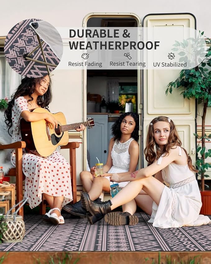 MontVoo Outdoor Rug 8x10 Waterproof Outdoor Patio Rug Mat Reverisble Plastic Straw Outdoor Rug for RV Camping Picnic Beach Balcony Boho Pink Grey