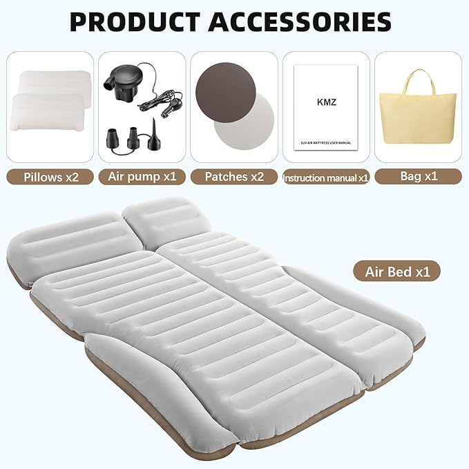 - What You Get – 1 x SUV Air Mattress, 2 x Pillows, 1 x Air Pump, 1 x Carry Bag, 1 x Instruction Manual, 2 x Repair Patches. If you encounter any issues with our mattress, feel free to contact us for assistance or a refund. We're here to help