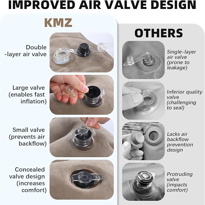 - KMZ SUV Air Mattress – This camping air mattress measures 188*128*14cm(74.02*50.39*5.51in) and comes with an off-white top and coffee bottom. The top and bottom are made of thickened flocking and durable PVC