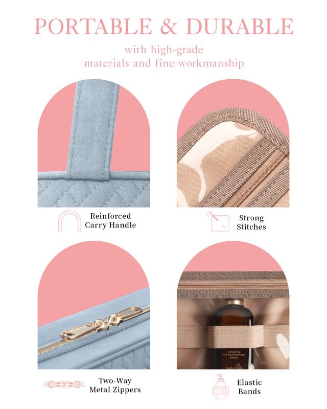 - WATERPROOF & MULTIPURPOSE: Perfect for various scenarios, this hanging toiletry bag for women includes leakproof and waterproof PVC pockets suitable for bathroom use. Its compact, sturdy, portable, and lightweight nature makes it an ideal companion for business trips, travel, gym sessions, camping, and home use. The added convenience of a grab handle ensures easy portability, making it a travel must-have travel.