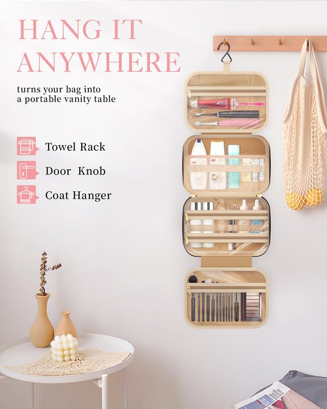 - STURDY HOOK DESIGN: Featuring a premium metal hook, the HOTOR cosmetic travel bag offers the convenience of hanging from a towel rack, coat hook, or any available space. This not only showcases your toiletries and cosmetics for easy accessibility but also saves valuable bathroom counter space. The sturdy metal hook is designed with a retractable feature, allowing it to be neatly stowed away when not in use.
