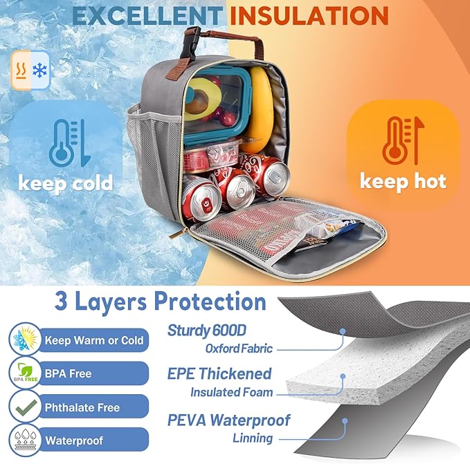 - Additional Pocket: The mesh pockets on the side of the insulated lunch bags for women kids can hold an umbrella and a water bottle, and the zippered pocket on the front can hold a cell phone,cutlery, napkins, keys and other small items.The dual smooth zippers is easy to open or close