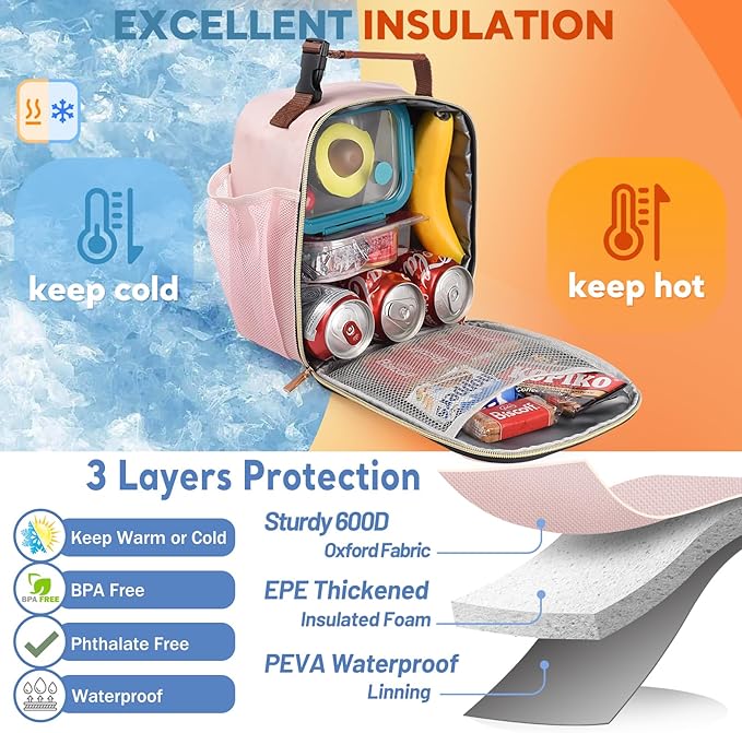 - Convenient Design Women Lunch Box : The lunch bag women insulated with extra cotton padding at the handle makes insluated lunch bag more comfortable for us to use, and the sturdy removable handle can easily attach the lunch box for kids women small to a backpack or tote bag for easy use in our daily life,convenient for boys girls lunch boxes for school