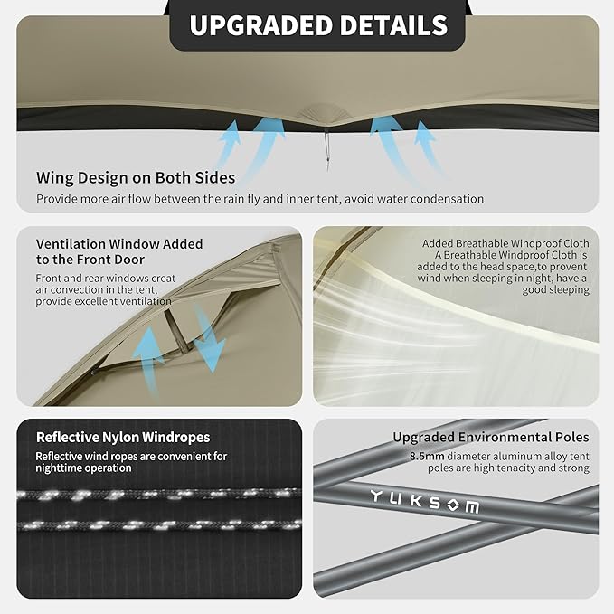 - Versatile Double-Layer Design for All Weather: The tent’s double-layer build provides added protection and airflow, with a high-density B3 mesh inner tent for ventilation and a rain fly that doubles as a standalone sun shelter.