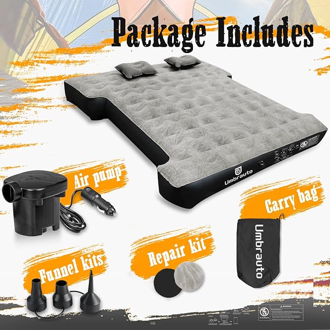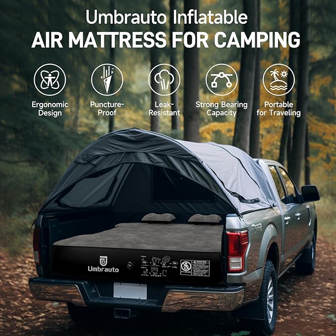 - 【Premium Material for Durability】Crafted from soft flocking material and upgraded 2024 extra thick Oxford fabric with environmental friendly PVC, the Umbrauto truck bed air mattress is puncture-proof and leak-resistant for long-lasting use.