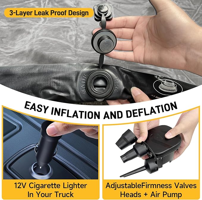 - 【Effortless Inflation and Deflation】Inflate and deflate the air mattress quickly and easily using the included air pump via the 12V cigarette lighter in your truck.