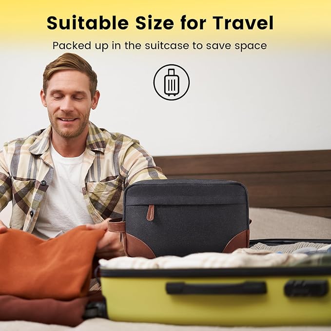 - Quality & water-resistant material: The toiletry travel bag is made of sturdy & wearable canvas material that has no unpleasant smell. The canvas and PU leather make the bag itself very well-constructed to keep the shape and protect your toiletries from splashed water