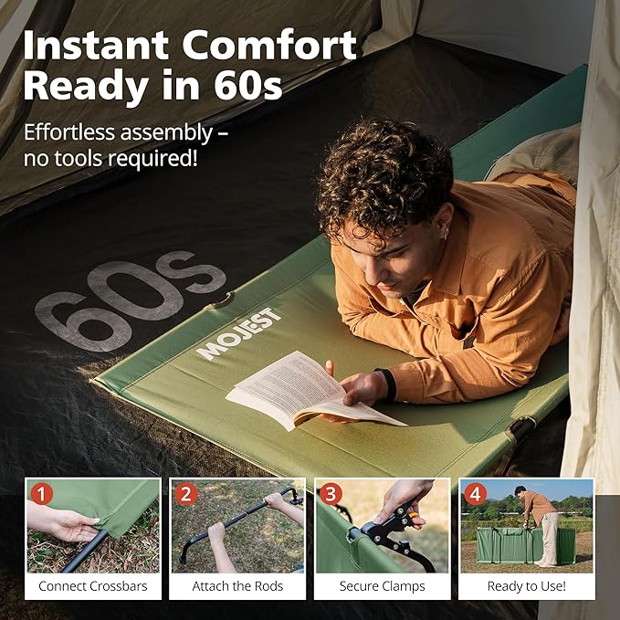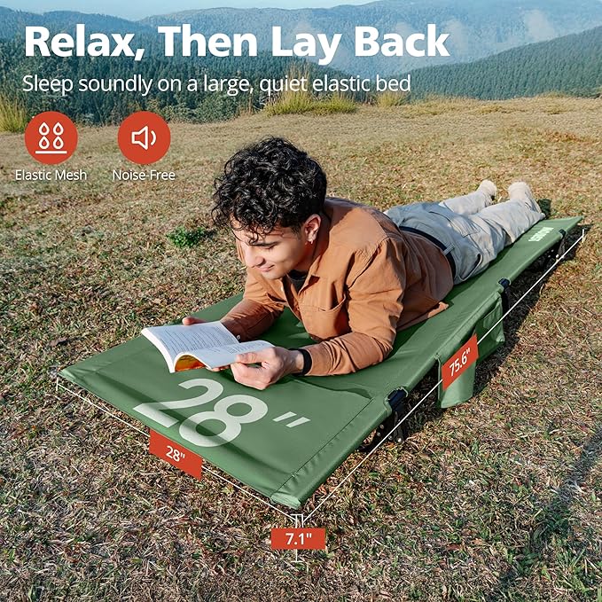 - Comfortable and Quiet Sleep – Rest peacefully on our firm camping cot with a durable Oxford fabric bed surface and an integrated pillow pocket for added comfort. Our 7-inch height design keeps you elevated, dry, and warm throughout the night