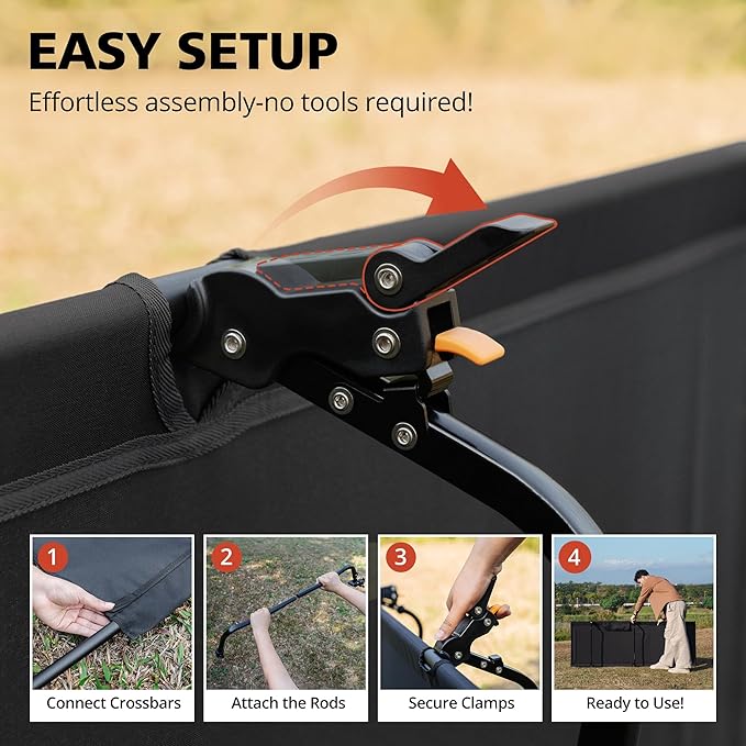 - Quick & Easy Setup – Thanks to the innovative lever-handle structure, setup takes as little as 1 minute once you're familiar with it. Simply position the two long support rods and press down to lock the legs into place securely and efficiently.
