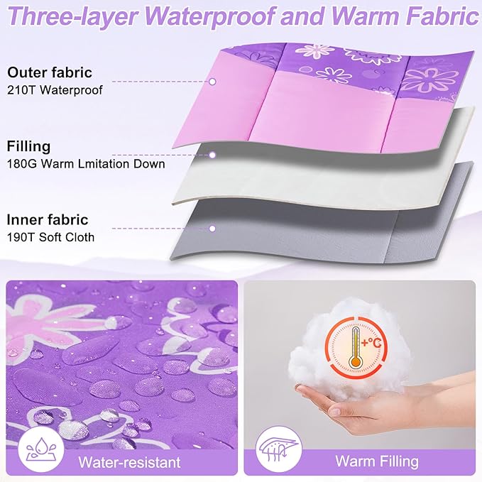 - Material: The camping sleeping bag features a multi-fabric design, with an outer layer made of 210T waterproof polyester fabric, helps you block small moisture, the inner layer is made of 190T soft cloth, while the filling is 180G warm lmitation down, providing enduring warmth; Machine washable without clumping or loss of filling