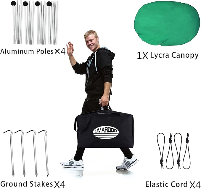 - DURABLE BEACH SHADE CANOPY: The strong and elastic Lycra fabric has UPF 50+ protection and water-resistant function. Rust-proof aluminum poles are attached with a elastic cord preventing moving.