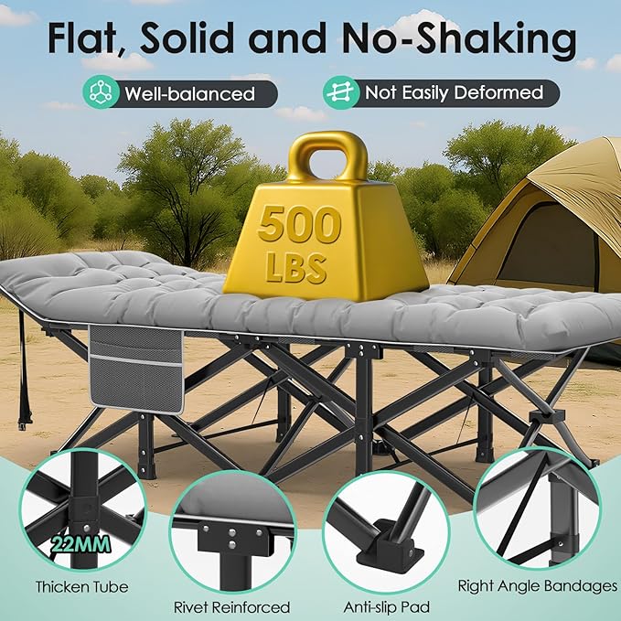 - 【Removable Skin-Friendly Mat】Our camping bed cot for adults has a soft and removable Mat, the 4" thicken cushion makes you more comfortable and warm when resting or sleeping. The cushion is made of skin-friendly and comfortable fabric, which is very suitable for people with sensitive skin or kids. You can also remove the mat when the weather is hot,and tie it up with the strap in it