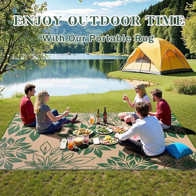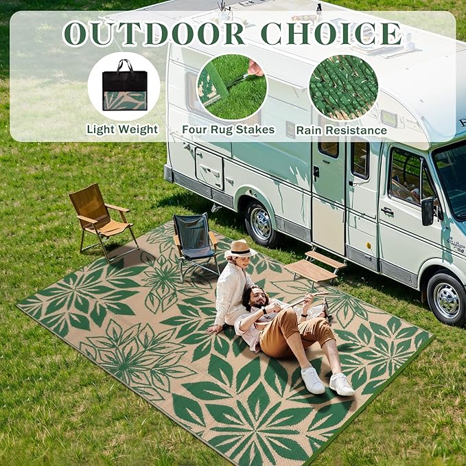 - 🏖️PORTABLE & FOLDABLE: Our RV rug is designed lightweight, foldable, and comes with a carry bag for easy transport, making it perfect for camping, beach trip, barbecue picnic or RV road trip. The plastic woven rug also comes with 4 stakes to help fix it in place for easy use. It wont hurt your lawn or the ground