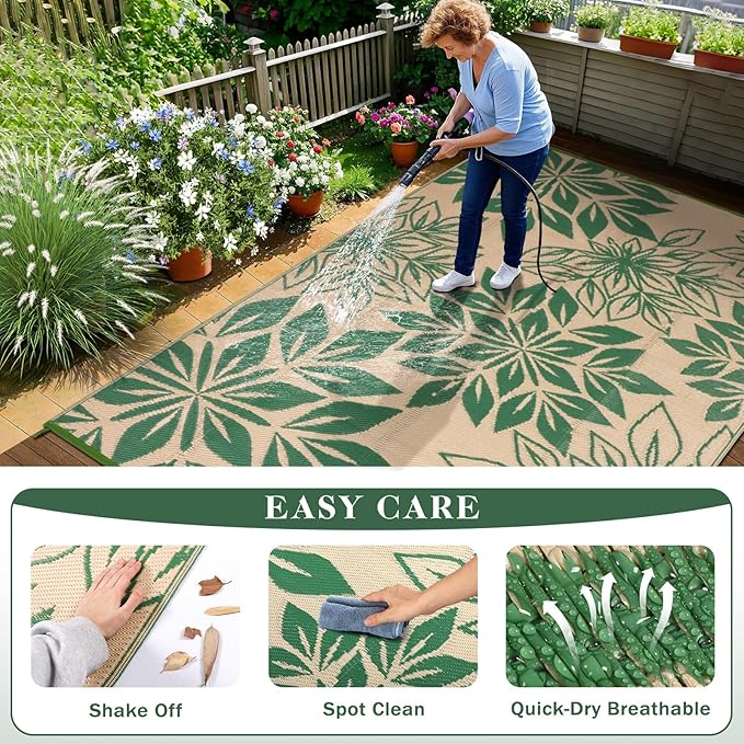 - 🚿EASY TO CLEAN: Designed specifically for outdoor environments. Simply shake off loose dirt and debris, rinse with a hose, or use a leaf blower, and use a soft cloth for spot clean when needed. The RV camping rugs dry quickly and are ready for use in no time. Regular shaking will keep it looking fresh and clean