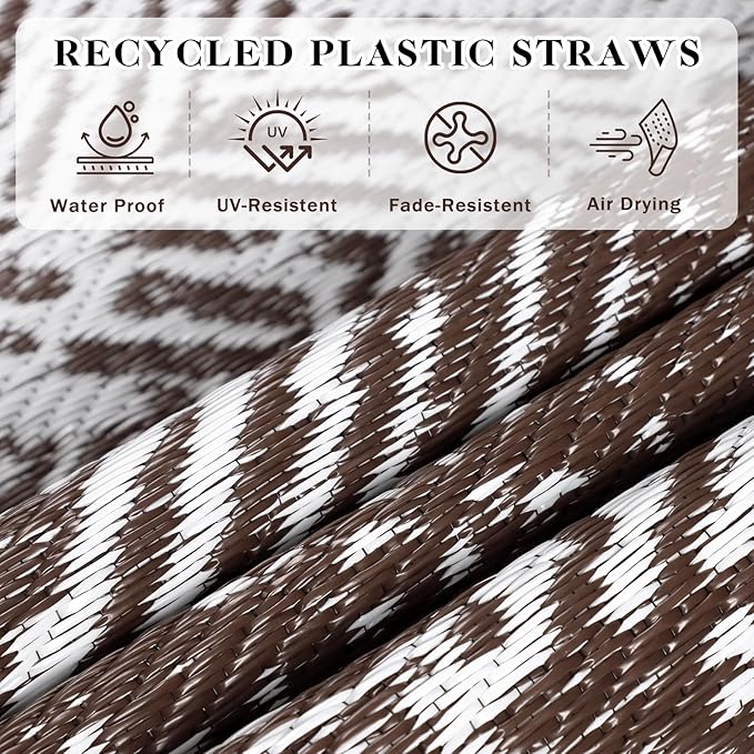 - ☀️WEATHER RESISTANCE: Our brown outdoor mat 5x9ft is crafted from high-quality UV-resistant materials, effectively preventing fading from prolonged sun exposure. The deck rug also boasts excellent water resistance, keeping it safe from rain, while ensuring long-lasting outdoor use