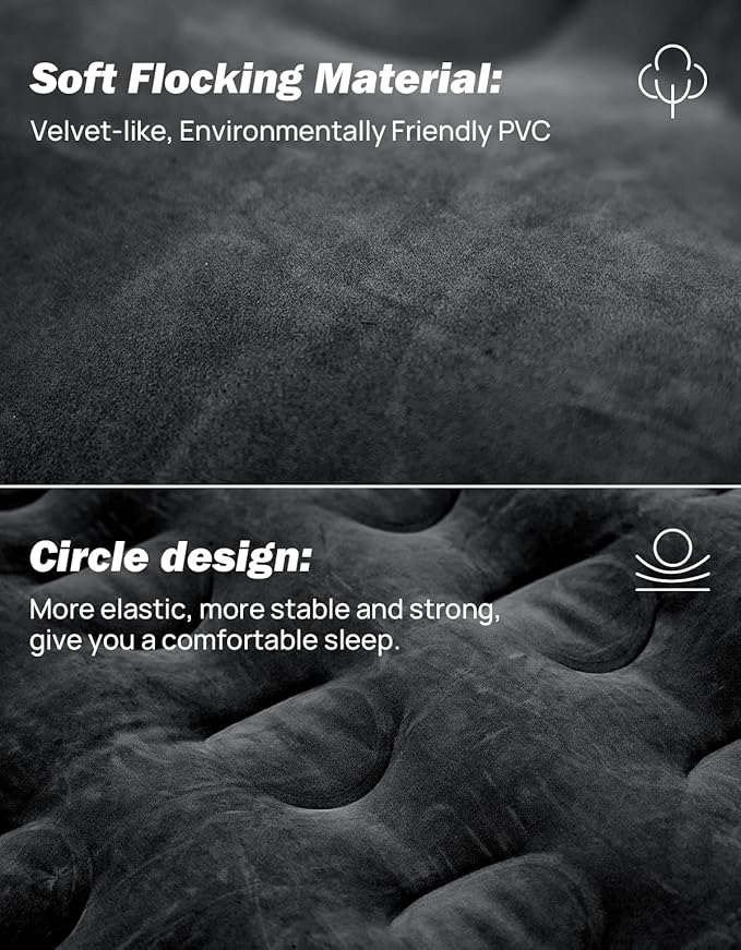 - 【Cavity Design】: Featuring three independent air chambers, our design significantly reduces the risk of air leakage while enhancing durability and longevity. The surface and pillows are crafted from a soft, velvet-like flocking fabric for a plush feel, and the high-quality PVC bottom helps prevent leaks.