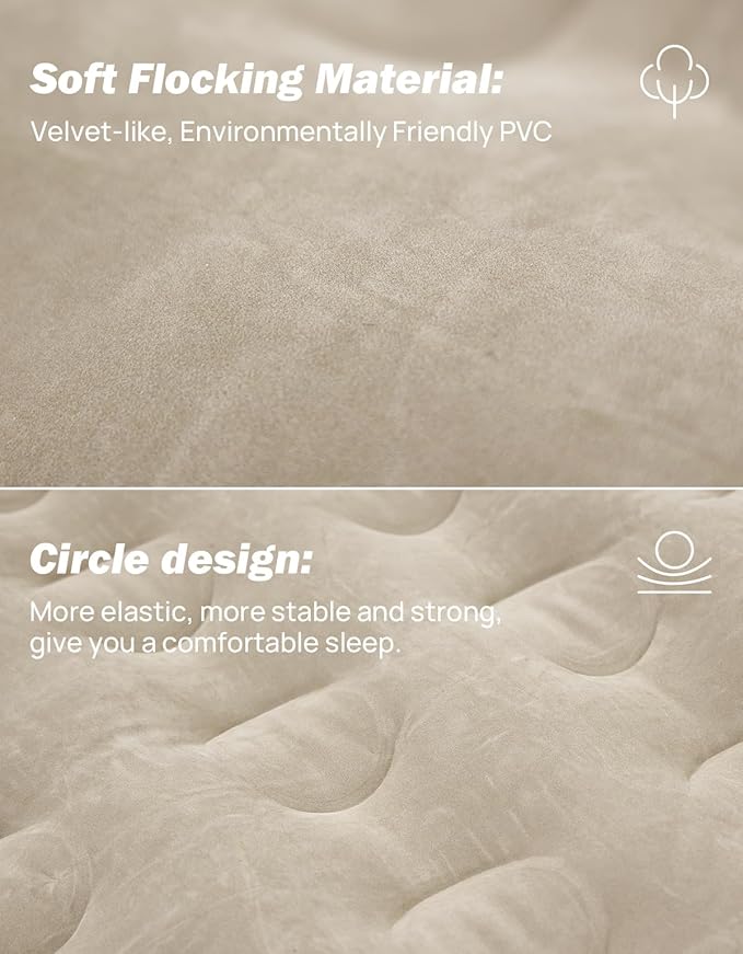 - 【Cavity Design】: Featuring three independent air chambers, our design significantly reduces the risk of air leakage while enhancing durability and longevity. The surface and pillows are crafted from a soft, velvet-like flocking fabric for a plush feel, and the high-quality PVC bottom helps prevent leaks.