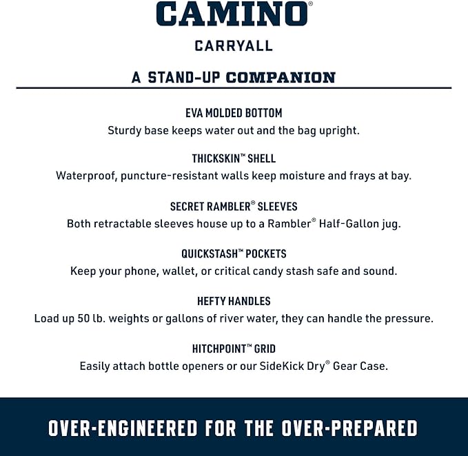 - MULTIPLE WAYS TO CARRY: The Camino 20 Carryall is a heavy-haulin’, up-for-anything tote. Throw it over your shoulder or pick it up by the CrossBar Handles. Whichever way you choose this bag pulls its weight, so you can carry on with your day.