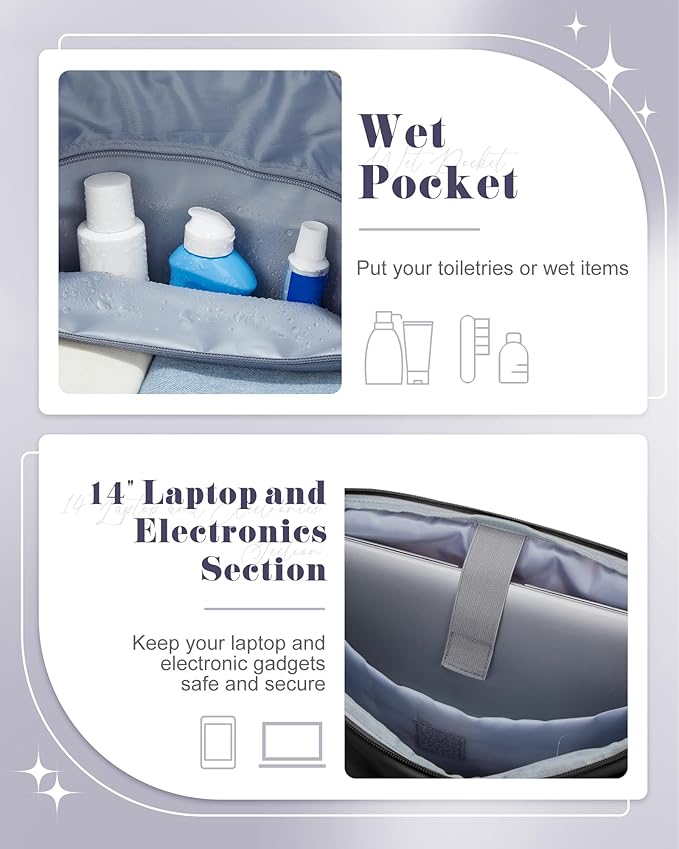 • Effortless Organization: Overnight bag keeps you organized on the go. The interior of the Weekend Bag is very spacious, it has multiple compartments and pockets including a 14” laptop compartment for clothes, cell phone, keys, glasses, toiletries, and other travel accessories, allowing you to make the most of your luggage space.This multi-functional carry-on bag will help you organize and store your items with ease, making them easily accessible when you need them.