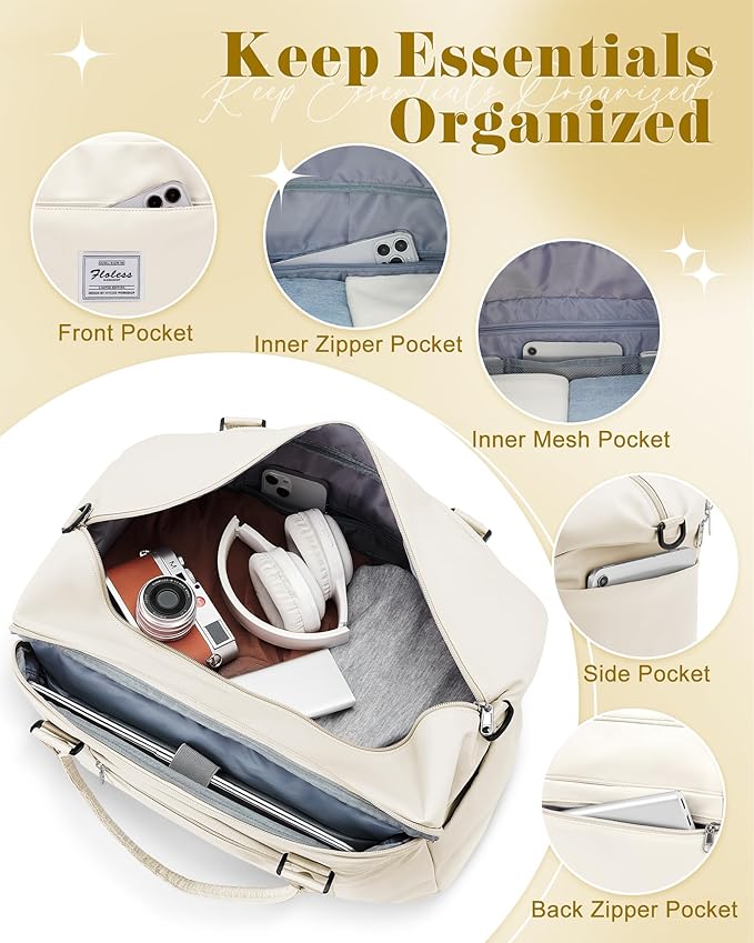 • Effortless Organization: Overnight bag keeps you organized on the go. The interior of the Weekend Bag is very spacious, it has multiple compartments and pockets including a 14” laptop compartment for clothes, cell phone, keys, glasses, toiletries, and other travel accessories, allowing you to make the most of your luggage space.This multi-functional carry-on bag will help you organize and store your items with ease, making them easily accessible when you need them.