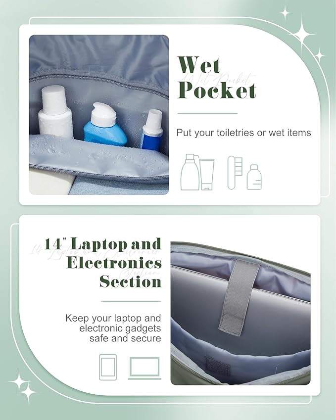 - Wet and Dry Sports Gym Bag: This women's travel bag is made of high quality waterproof fabric that is durable, waterproof and tear resistant. The zippered, waterproof PVC-lined pockets make it easy to store wet clothes, bathing suits or towels. Whether you're hiking, exploring the city, or taking a weekend getaway, this women's travel bag will be a reliable companion.