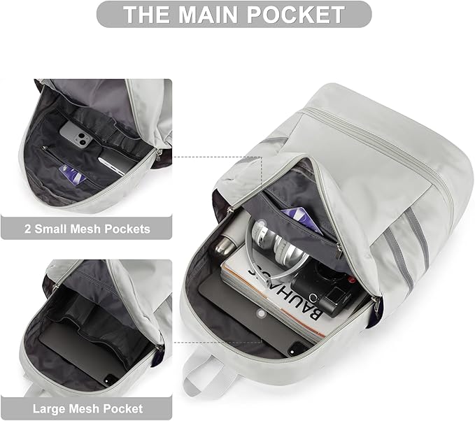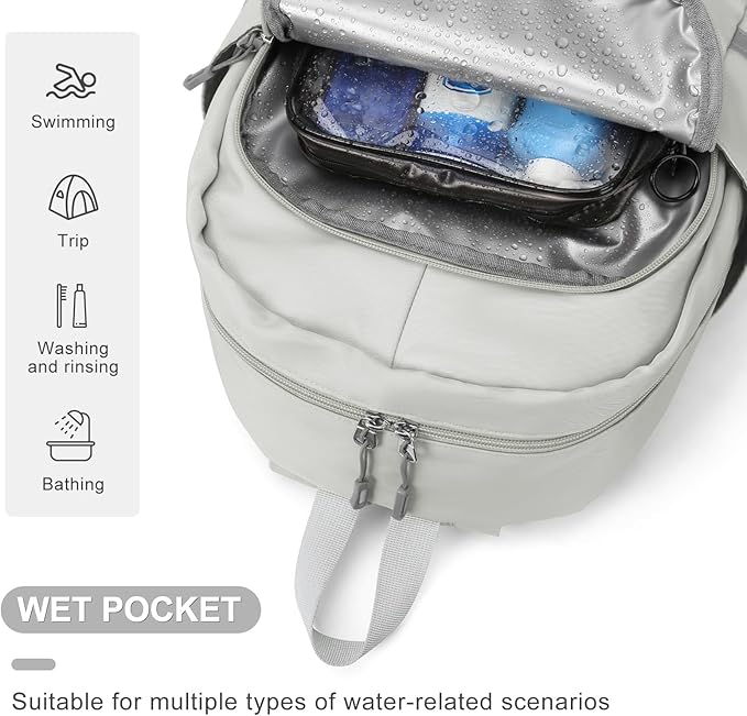 - WET POCKET: The wet pocket can hold wet items, such as toiletries, towels, swimming suits, etc., which is convenient for you to use when you are on a business trip or shower after exercise, and avoids getting wet in other parts of the backpack