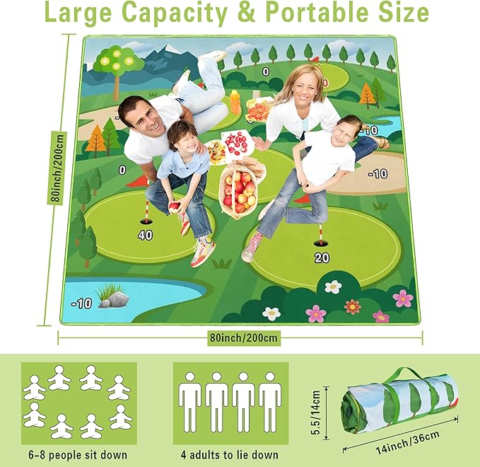 - This picnic blankets measures 80”L x 80”W,is large enough for 6-8 adults to sit, accommodating up to 4 adults lying and provides enough space for food and drinks. Our large picnic blanket is the best choice for a family outing or friend gatherings.