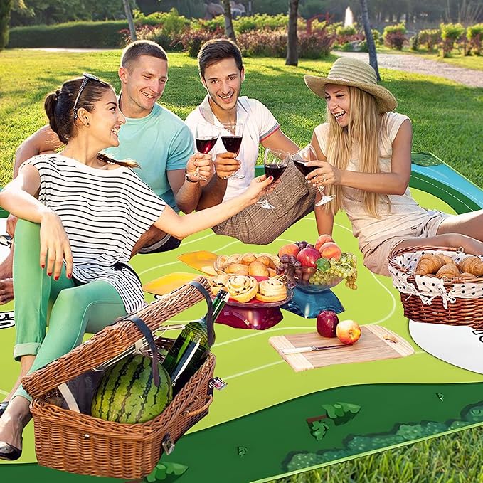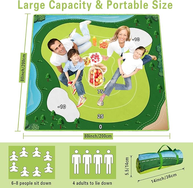 • This picnic blankets measures 80”L x 80”W,is large enough for 6-8 adults to sit, accommodating up to 4 adults lying and provides enough space for food and drinks. Our large picnic blanket is the best choice for a family outing or friend gatherings.