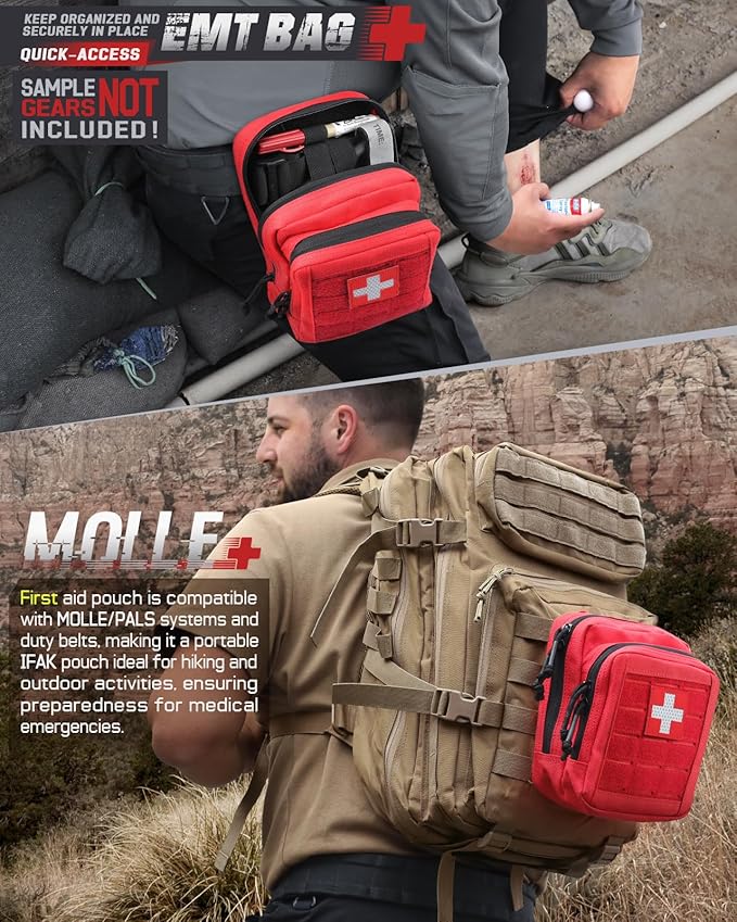 - FIRST RESPONDER: Med Pouch is designed with a low-profile, lightweight style that guarantees easy maneuverability, providing maximum functionality without hindering your movements. Empty first aid bag is an excellent choice for tactical medics, first responders, combat lifesavers, and outdoor enthusiasts (hiking/camping), offering the flexibility to customize essential supplies and ensuring critical time is saved to protect yourself or others, making every adventure both possible and safe.