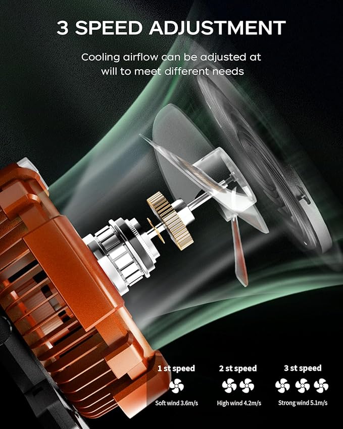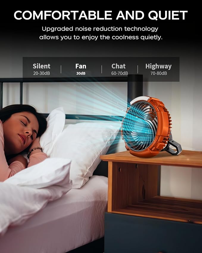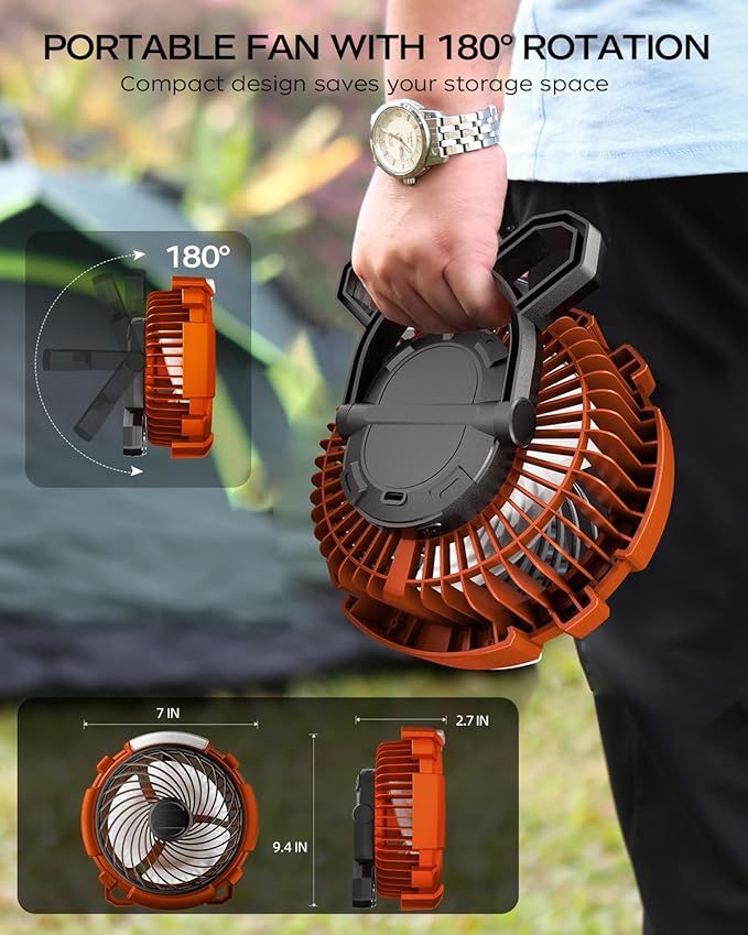 - [Compact Durability] Our portable camping fan is compact yet sturdy, designed to accompany you on all your journeys. Easily pack it away in your backpack when not in use. It‘s your ideal companion for camping, fishing, hiking, and beyond!.