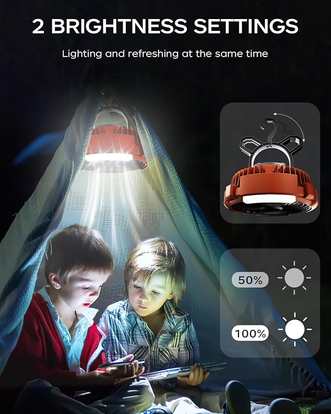 - [LED Camping Lantern] Illuminate your campsite with ease using our 2-in-1 Camping Tent Fan equipped with adjustable brightness levels. Whether you're camping under the stars or trekking through the wilderness, our LED lantern ensures visibility in the darkest of nights.
