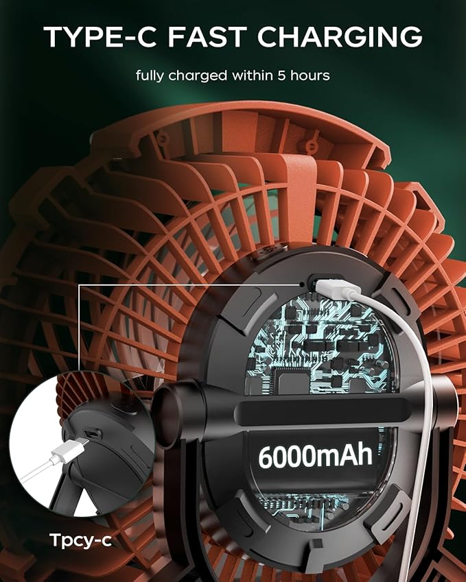 - [Long Battery Life] Camping Fan with a whopping 6000mAh battery capacity, enjoy up to 6-16 hours of continuous usage on a single charge, ensuring your adventures are never cut short. Charge fully in just 5 hours and embark on your outdoor escapades with confidence.
