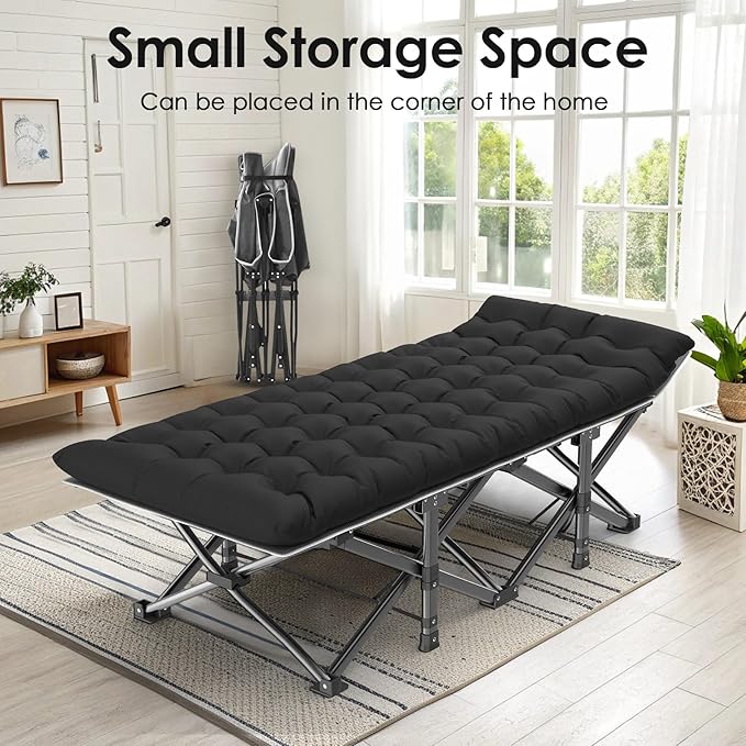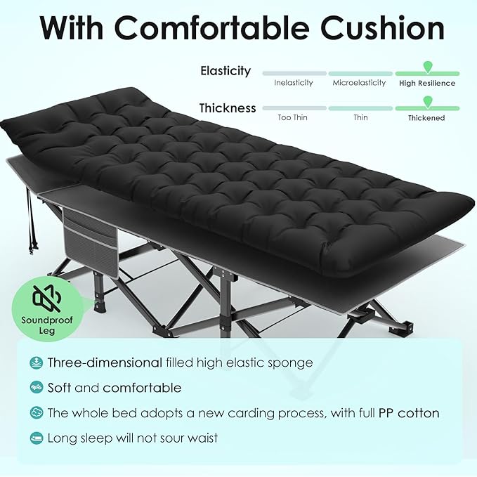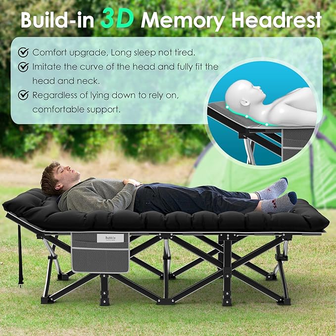 - 【Built-in Pillow Design】The headboard of our cot is a slanted design with built-in pillows, no need for extra pillows. The slight incline is ergonomically designed to ensure no more back, neck or shoulder pain in sleep! The mattress is also soft and thicker, so this is a very comfortable folding camping cot