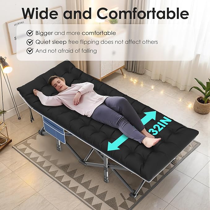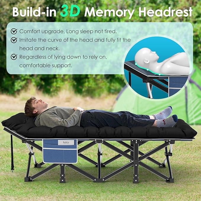 - 【Built-in Pillow Design】The headboard of our cot is a slanted design with built-in pillows, no need for extra pillows. The slight incline is ergonomically designed to ensure no more back, neck or shoulder pain in sleep! The mattress is also soft and thicker, so this is a very comfortable folding camping cot