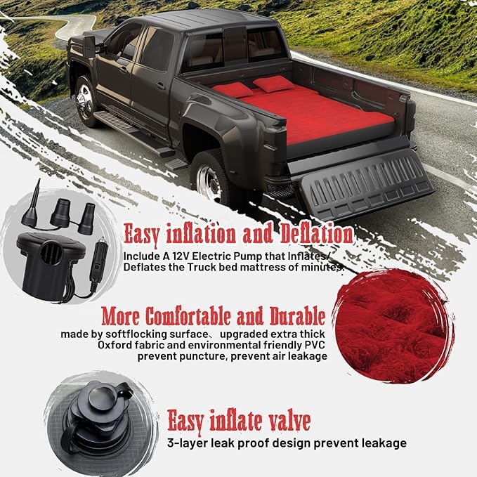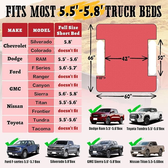 - FULL SIZE Truck Bed Mattress: This air mattress is specifically designed for 5.5'-5.8' FULL SIZE pickup truck beds. It is NOT suitable for midsize truck beds. Please ensure your truck has a 5.5-5.8ft truck bed before making a purchase.